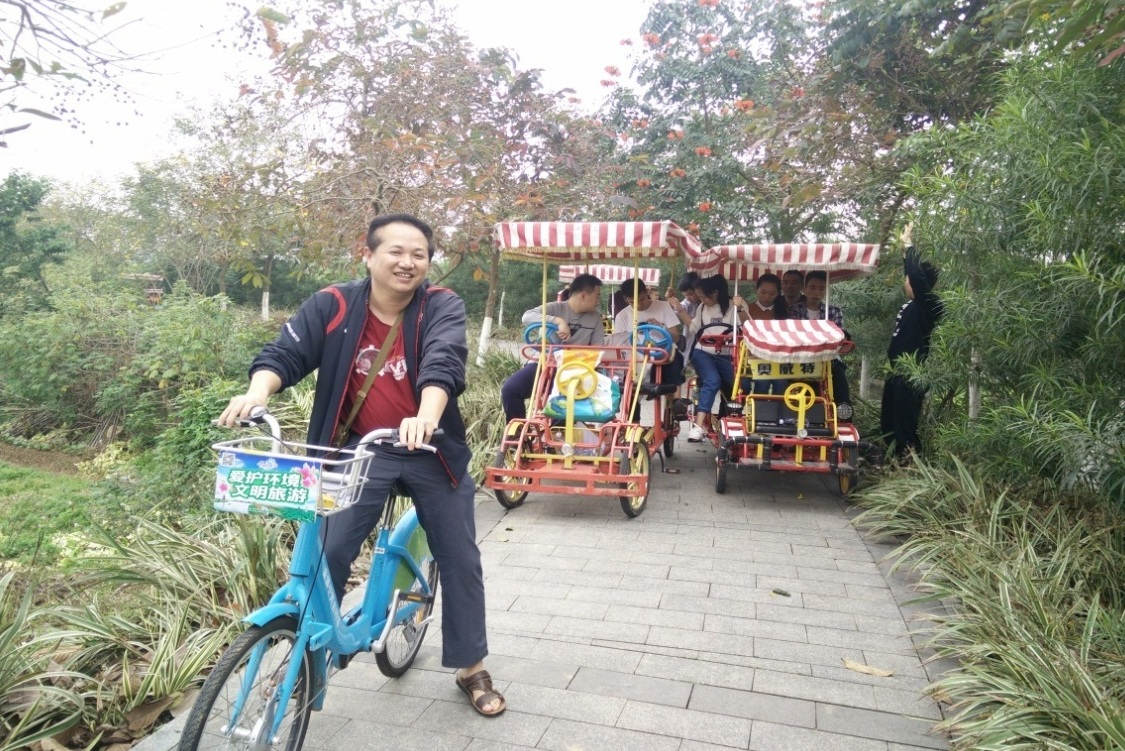 合影后,有的人在緩慢前行,靜靜地欣賞四周的美景,感受視覺的變幻。有的人邀上三五知已,租上自行車繞湖一圈,邊騎邊聊,到正當櫻花、桃花爭艷的地方,停下來打開手機,盡情的拍照,享受大自然春天氣息,有同事調(diào)侃說,好像在拍青春校園片,洋溢出幸?鞓返男δ。有的人和自己的愛人一起,一幕幕溫暖的畫面,讓他們拋開所有的事,其樂融融,心里暖暖的。也有些嘴饞的人,到印象水鄉(xiāng)尋找特色的小食…….